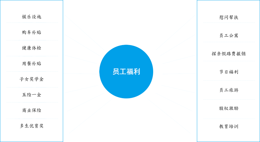• 在法定福利的基础上,公司为员工提供全方位的企业福利,涉及到员工衣食住行各个方面,共 计15大项,21个小项,为员工的生活雪中送炭、锦上添花
